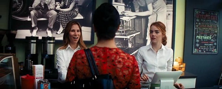 Pero volvamos al tema de la fama y la necesidad de reconocimiento público. Es algo que ansían todos los personajes de Chazelle como el que interpreta John Goodman en 'Calle Cloverfield 10', donde se banagloria de ser el único habitante de la Tierra que sabía lo que iba a suceder y por eso ha construido el refugio donde es quien manda. En 'La La Land', hay una doble escena que lo explica a la perfección. Al principio del film, cuando Mia trabaja en la cafetería, entra una actriz famosa a pedir un café para llevar y ella la mira con admiración casi adolescente. Al final, cuando ella ya es famosa, repite exactamente los mismos movimientos de esa actriz, ha conseguido su sueño: ES FAMOSA, como la Ingrid Bergman que decora su habitación ella ahora decorará las paredes de otras aspirantes a actriz y poco sabremos de las películas que interpretará, tal vez, ya ni le importe y se haya convertido en otro producto más del establishment como cuando Sebastian firma el contrato para tocar el teclado en un grupo de música comercial.